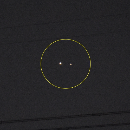 見た目と異なり望遠レンズ越しの写真では地味な点々が二つ、明るい左の星が木星、ちょっと暗くみえる右の星が土星です。視力が少なくとも1.0以上であればなんとか2つの星に見える程度の近さです。。。