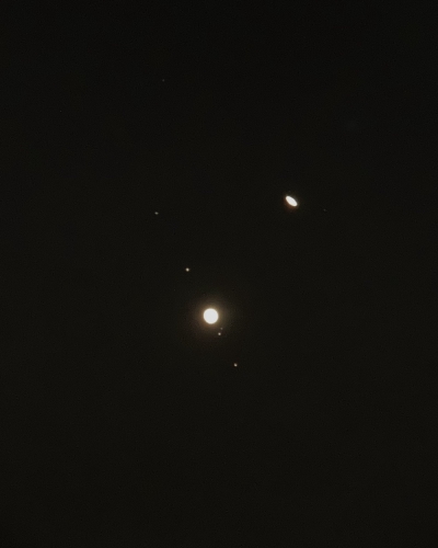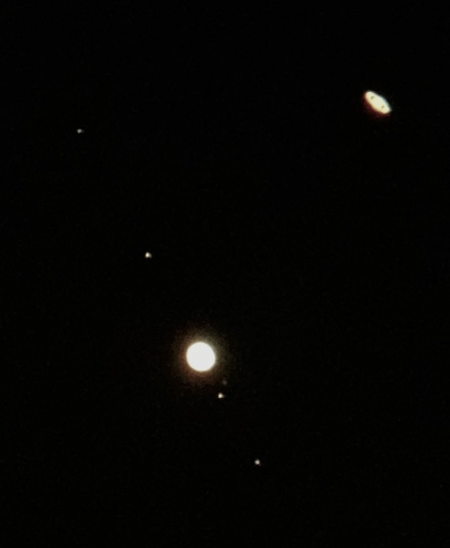 パッと見、へえぇーという写真かもしれませんが、この超狭い視野の中に木星と土星、両方の衛星が収まっているということ自体が通常は考えられないのです。天体望遠鏡を触ったことがあれば尚更感慨深いと思います。