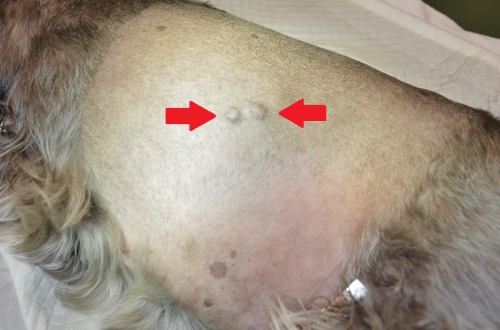 それは一見したところよく見られる皮膚の腫瘤でしたが、各々の腫瘤が1センチ以下と小さいものの、同じようなカタマリが隣接していること、片方の腫瘤の色調が黒っぽいことが気になります。しかしながら、可動性もあり、見たところそれ以上の違和感はありません。