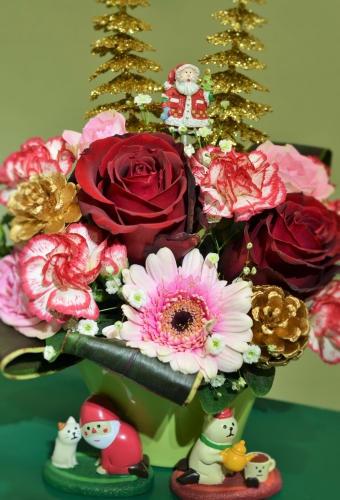 「バラ」・「ガーベラ」・「カスミソウ」・「カーネーション」・「ゴールド松かさ」