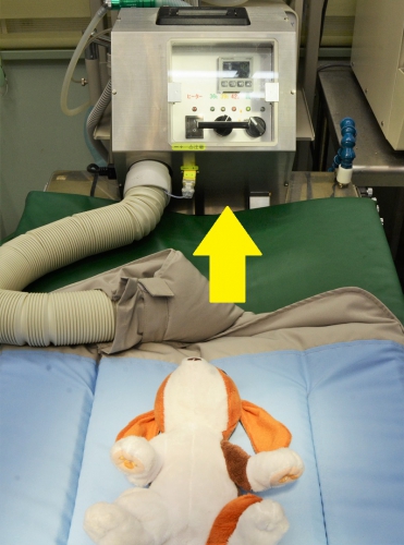 左の製品が昨年度、導入した温風方式の機器で、長時間の比較的大きな手術に適した機器です。右写真が温水循環方式のもので、不妊去勢手術など比較的短時間の手術で、体のあまり大きくない動物に対して使用しています。