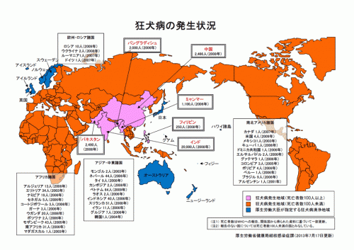 最後に下の図をご覧になってください。赤とピンクで塗られた地域は狂犬病が現在発生し続けている地域です。それと比べると日本をはじめとする青い色の狂犬病清浄地域はわずかに数えるほどしかないという現実をご理解いただき、狂犬病予防の重要性をあらためて考えてみられてはいかがでしょうか。