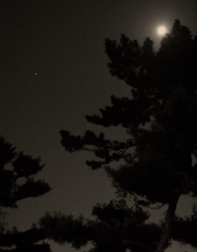 下の写真は松の木をアクセントに月と火星がキレイに見えるよう試行錯誤しましたが、写真にするとなかなか伝わらないのは毎度のことです。実際、なんとも言えない美しい光景でした。