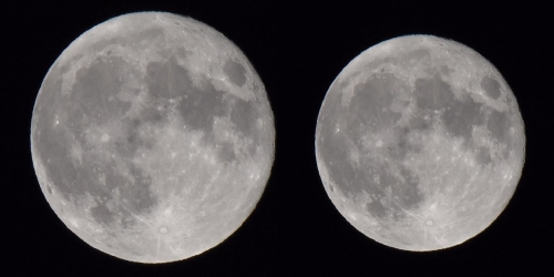 下の写真は左のスーパームーンと右の最小の満月、マイクロムーンのざっくり大きさ比較です。左右に並べると意外に差があるように見えますが、実際に満月を見てその差が分かるかどうか試しても面白いかもしれません。