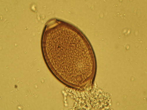 糞便検査による顕微鏡検査虫卵を見つけることで診断されます。犬鞭虫卵は下の写真に見られるように、褐色でレモン状の形をを持ち、両端に特徴的な卵栓と呼ばれる「栓のような構造」を持つのが特徴です。