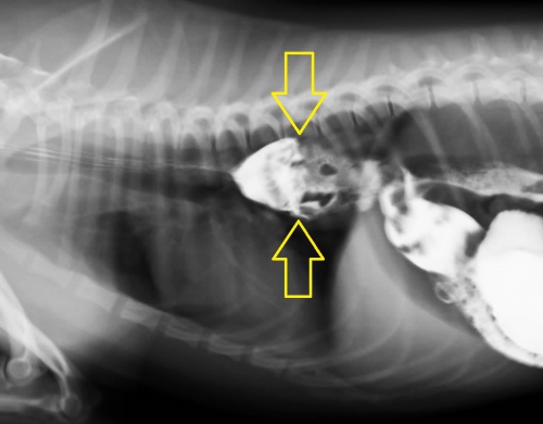 下が造影検査によって明らかになった胸部食道異物の例です。上2枚の写真はリンゴ、下2枚は牛皮ガムが異物となっています。犬のおやつ類などは硬く、見た目に明らかな異物であっても撮影条件によっては意外にレントゲン写真に写りにくいため、診断する上で難しさを生じます。