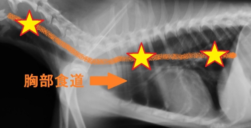 下図は食道の大凡の位置関係と、食道閉塞を起こしやすい場所を示しています。左が頭方向、喉から胸に至り胃の入り口までのオレンジ色の太い線で示された食道の中を通ります。3か所の黄色星印が異物の閉塞を起こしやすい場所です。異物が詰まりやすい場所は食道が構造的にわずかに狭くなっている部位のやや手前に一致しています。
