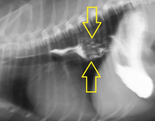 異物を原因とする消化管閉塞が食道に発生したものです。様々なものが原因となり得ますが、主に犬用のおやつや食品などを原因とすることが特徴です。「口にしたものを取られまい」と慌てて飲み込むなどがきっかけになることが多く、食品が原因となりやすいというのもそういった背景があると考えられます。