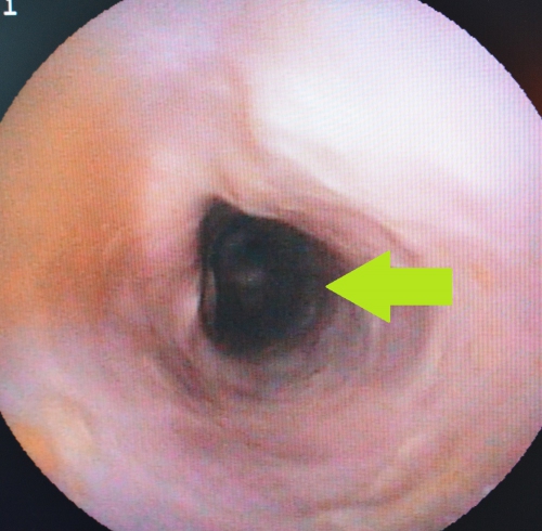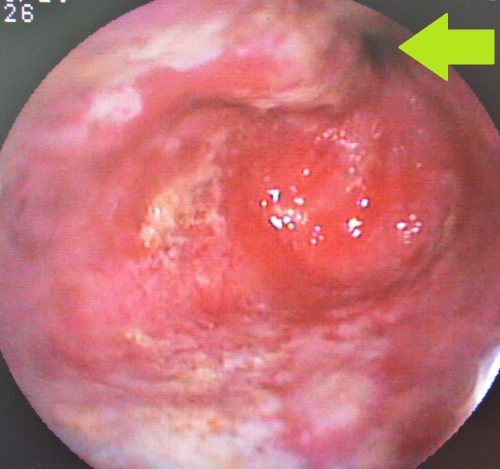 さらに食道異物による内側からの圧迫に弱く、またその修復能力も高くありません。下の写真は異物を摘出した後のものですが、黄色矢印の先が凹んで周囲の粘膜から出血しています、その中央部は異物に圧迫されて潰瘍を作っています。また、緑矢印の先の赤黒い部分は粘膜面うっ血が生じて、食道粘膜に広くダメージを起こしているのが分かります。