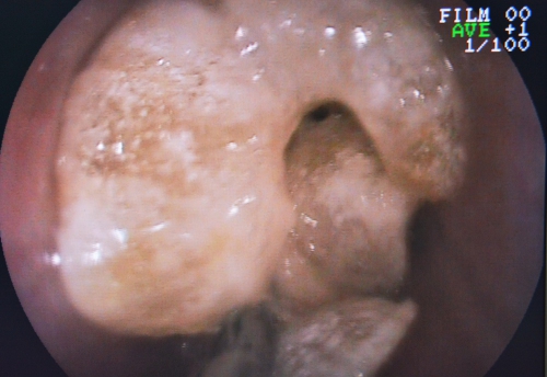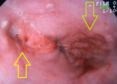 下の2枚の写真は胸部食道のほぼ同じ場所を撮影した内視鏡画像です。左写真が正常な食道、右写真が重度の慢性食道炎結果生じた食道狭窄の内視鏡写真です。左の正常と比べると食道の粘膜に激しい変化を生じているのが確認できます。