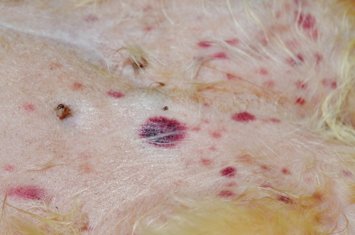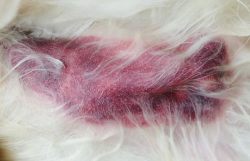 また、皮膚病を掻き壊した際や小さな傷、爪切りでの出血が止まらないとか、動物病院での採血の際に止血しにくいなどで偶然発見されることもあります。下の写真は異常な皮下出血の一例です。