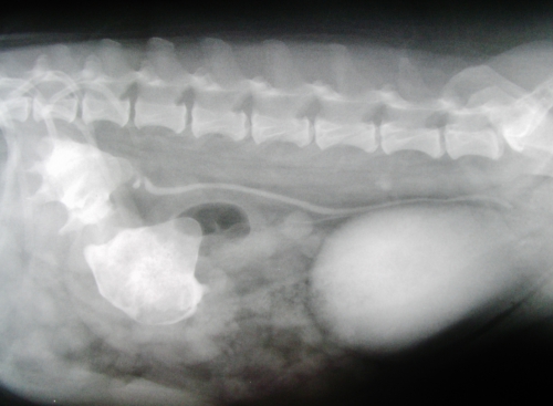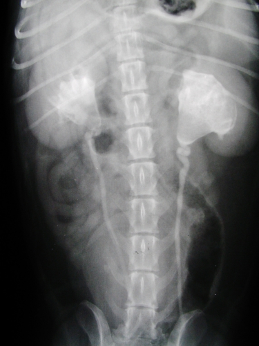 尿管結石尿管を完全に閉塞した場合には激しい腹部痛を起こる可能性がありますが、犬ではこういった痛みの把握は難しいこともしばしばです。元気食欲がないだけであまり症状がないように見えることも多いものです。腎結石は両側に同時にできることもあり、それらが同時期に相前後して尿管閉塞を生じる可能性もあり、この場合には突然の無尿乏尿に伴って腎不全による尿毒症などが発症する可能性があります。