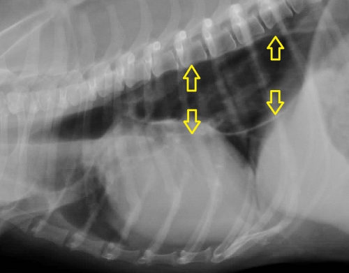 下のレントゲン写真が巨大食道症の一例で、黄色矢印の先に飲み込んだ空気によって拡張した食道壁を示す特徴的な白いラインが見えます。右下が正常の胸部レントゲン写真です。