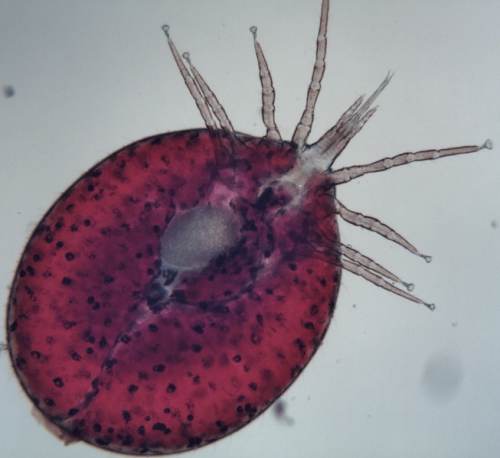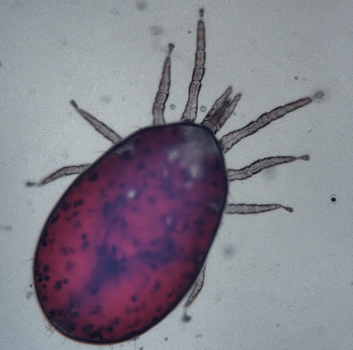 下の2枚の写真はウサギの体表から採取したイエダニと診断されたダニの顕微鏡写真です。イエダニは通常は褐色調の乳白色ですが、吸血をすると赤色調となります。写真では血液が充満したダニの腹部が明瞭に観察できます。左が吸血をして消化管に血液が充満している包血成ダニと思われる写真、右が包血若ダニと思われる個体です。