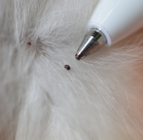下の写真がウサギの体表面でのイエダニです。右上のボールペンのペン先の黒っぽい粒が吸血した虫体です。少々見えにくいですが、その左上10時方向に吸血していない小さいイエダニが見えます。中気門類のダニは1ミリ前後と、肉眼でその形態を確認確認することは困難ですので、その分類と診断は顕微鏡検査で行います。