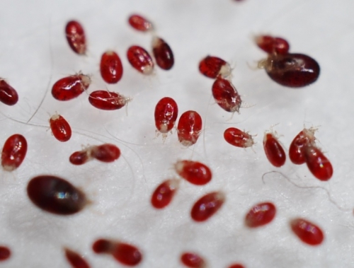 このうちイエダニ(Ornithonyssus bacoti)は「長い卵型」で吸血性であり、通常は褐色調の乳白色ですが、吸血したものは赤色、「あずき色~暗赤色」です。特にネズミ類に寄生しますが、ネズミが出入りする環境や大量発生した場合などにはネズミから離れて、人間や他の哺乳類で吸血被害を引き起こします。人間で生じる病害は、「イエダニ刺傷」として知られています。人間のイエダニ症の情報は以下のサイトをご覧ください。