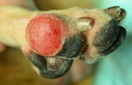 真皮に発赤した脱毛や潰瘍を伴う結節を形成し、多発性にみられることもあります。その場合、1〜5cm程度の結節が、数個から場合により数十といったレベルで発生しますが、細菌などによる二次感染を起こさない限り”痛み”や”痒み”などの症状はあまりみられません。