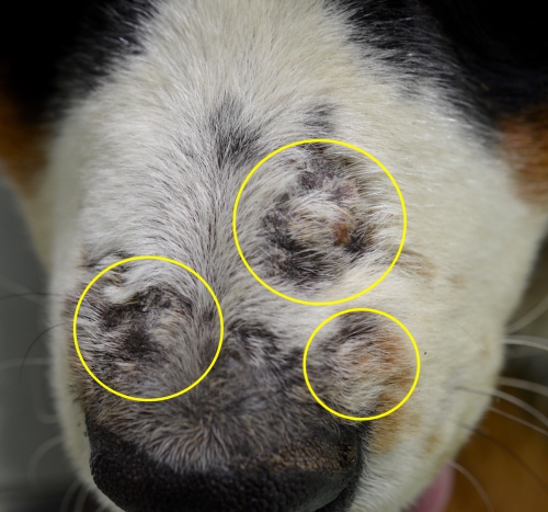 病変は眼瞼、口吻部、鼻鏡、四肢、陰のうが特に重度になりやすく、肺、脾臓、肝臓、骨髄、鼻腔にも広がります。