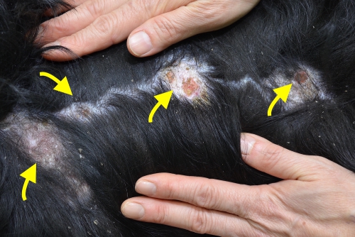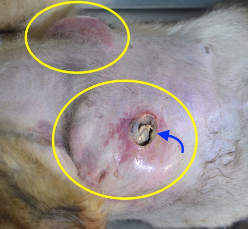 真皮に発赤した脱毛や潰瘍(かいよう)を伴う結節を形成して多発性に広がることもあります。その場合、1〜5cm程度の大きさの結節が数個から場合により数十といったレベルで発生しますが、二次感染を起こさない限り”痛み”や”痒み”はあまりみられません。
