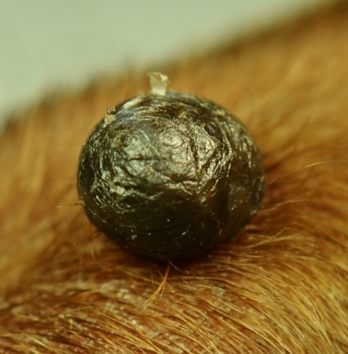 犬の皮膚に発生するメラノーマはすべての皮膚腫瘍のうちの6%前後を占めるとされており、体表面のあらゆる部位に発生します。目立たない黒い斑点から急速に成長する大きな腫瘤まで、おおよそ0.5~2cmと様々です。