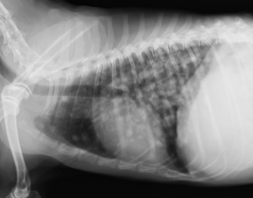 下の写真が肺転移の一例です。(右写真が正常です。)