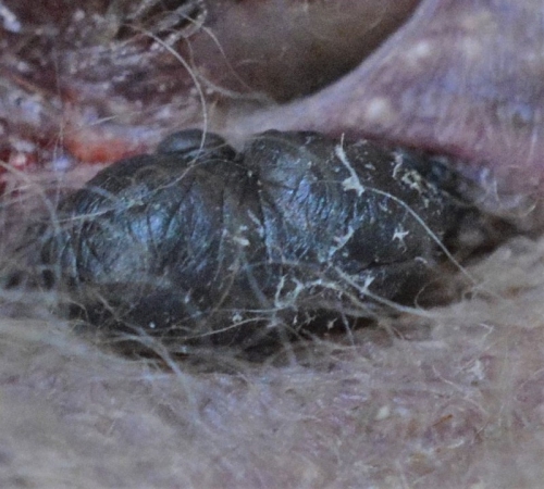 下の写真は各々1cm弱の皮膚メラノーマですが色素が薄いため、見た目では飼い主さんにはメラノーマが想像できないのではないかと思います。このメラノーマは悪性肺転移を起こしました。