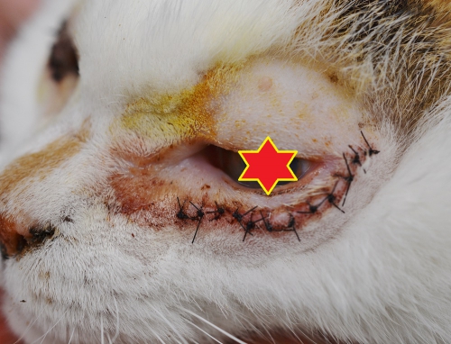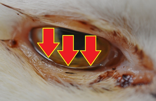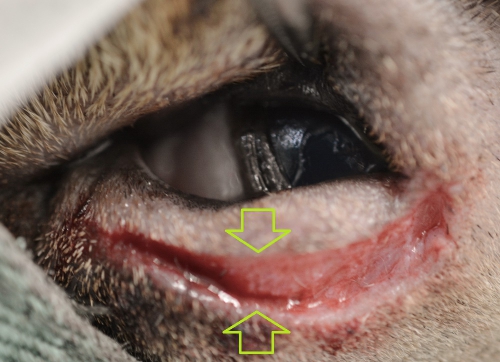 下の写真は両側に眼瞼内反がみられた猫の写真です。右下写真の矢印先の下眼瞼全体に眼瞼内反が見られています。眼瞼内反が起こると瞼の内側の粘膜と触れ合っていた角膜表面が皮膚と被毛に直接接触して強い刺激を角膜に生じて涙が止まらなくなります。目から溢れた過剰な涙が周囲の毛を濡らしている様子がお分かりでしょうか?