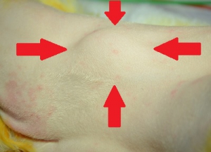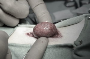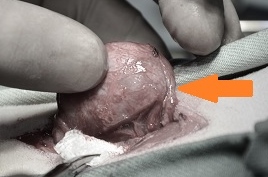 甲状腺腫瘍(甲状腺癌)は特徴的な症状を起こすことはありませんが、ほとんどが飼い主さんからの「頸部のシコリ」があるという訴えで発見されます。(下写真)