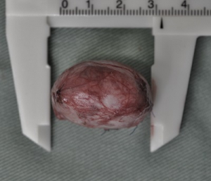 可動性があり、周辺リンパ節や組織に腫瘍細胞の浸潤のみられない早期の甲状腺癌は外科手術によって治癒する可能性があります。発見が遅れて周囲に甲状腺癌が浸潤してしまうと手術ができない、もしくは不完全な切除となるものもあります。下の写真が手術中のものと摘出した大きさ3cm超の甲状腺癌の写真です。