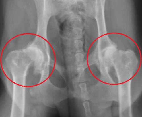 下は股関節の進行した変形性関節症レントゲン写真です。赤丸の中が股関節ですが、大腿骨頭は変形して、関節内には骨棘の形成がみられます。同じ部位の正常写真が右です。
