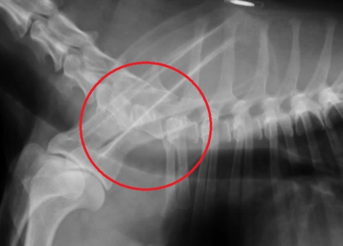 下の写真は日常的に常に頸部の痛みを訴えており、前足の歩行にも問題を生じている患者さんの重度の頸椎~胸椎変形性脊椎症レントゲン写真です。