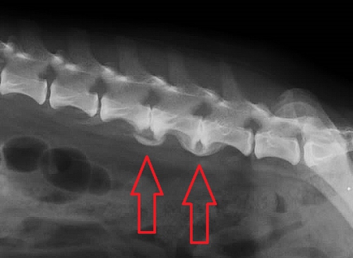 下のレントゲン写真は第4~5腰椎、第5~6腰椎間変形性脊椎症です。赤矢印の先に隣り合う腰椎の間に形づくられた「椎骨のブリッジ」形成がみられます。こうしたレントゲン像は「無症状にみえる」虫高齢犬でしばしば観察される変化です。