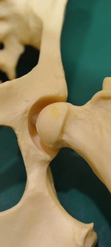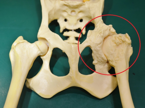 下の写真は股関節重度変形性関節症をしめす骨格モデルです。画面左の赤丸の中が重度に変形した関節構造をモデル化したものです。真ん中が正常な股関節で右がその部位の重度の変形関節症(拡大)です。