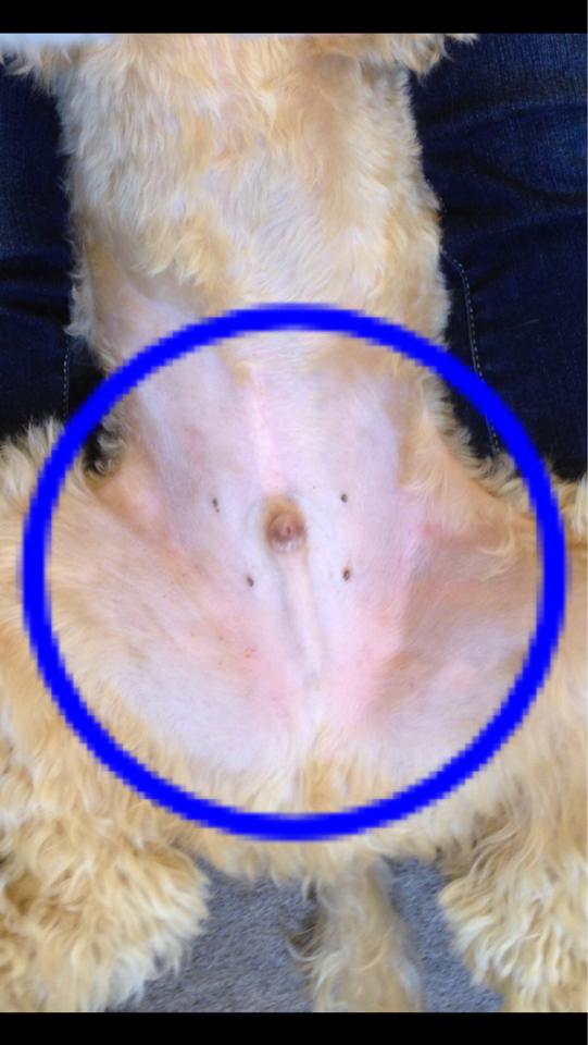 毛を刈る範囲は右下写真を参考にしてください。 これくらい刈ってしまっても、立ったとき、横になって寝ているときには見えないものです。この写真を動物病院の方に見せして毛刈りしてもらってもよろしいかと思います.
