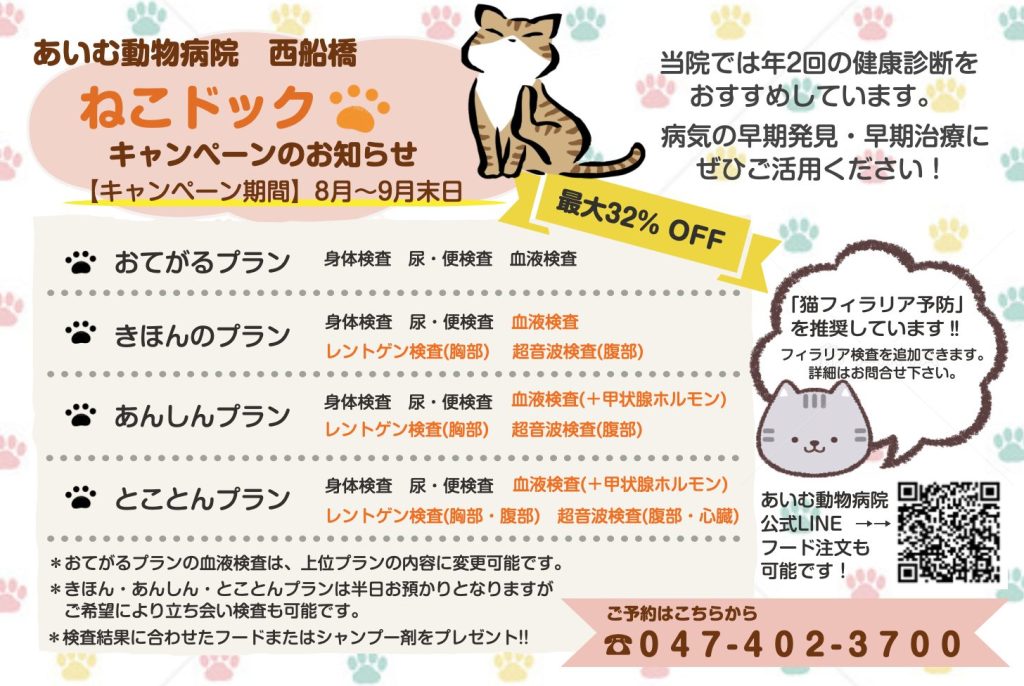 【8月1日〜9月30日】の2ヶ月間、ねこちゃんの健康診断プラン「ねこドック」の最大32%OFFキャンペーンを行います。